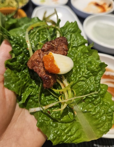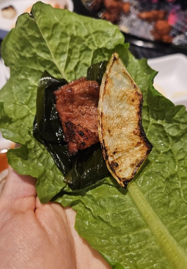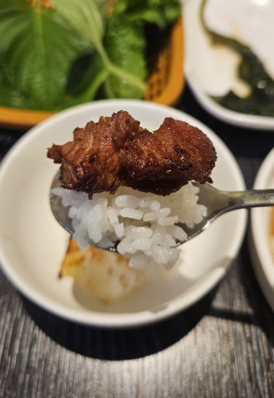 명이나물에 고기랑 밥 올려서도 먹고