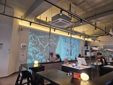한쪽 벽면에는 파도가 치는 영상이